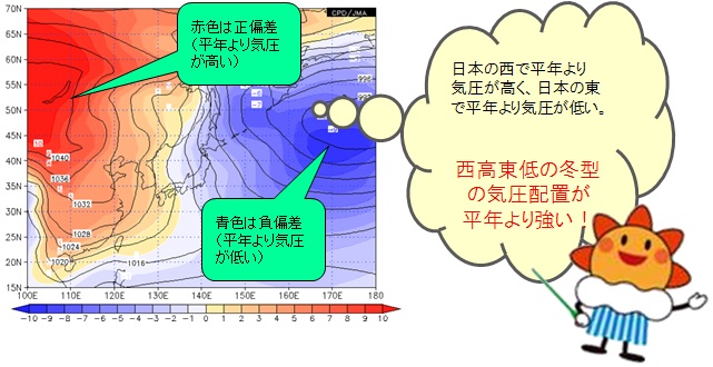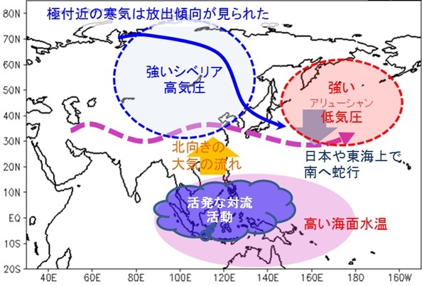 大気の流れの模式図 一方、極付近から中緯度帯に寒気が南下しやすく、またユーラシア北部から日本付近で偏西風が蛇行し、日本へ寒気が一層流入しやすくなりました。 これらにともない、日本付近の地上の気圧は西高東低の冬型の気圧配置が卓越しました。 |