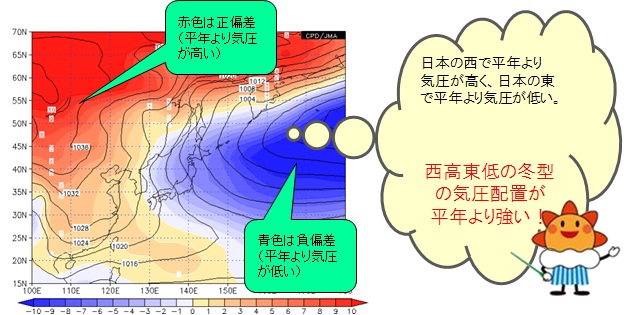 2011年1月は、2005年12月と同様に、大陸の高気圧は平年より強い一方で、東海上の低気圧も発達し、平年に比べ日本付近で等圧線の間隔が狭くなっています。 日本付近で北西の冷たい季節風が強くなりました。 |