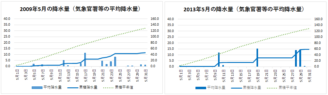 5月の中国地方の降水量(気象官署等の平均降水量(棒グラフ)と累積降水量(折れ線)) (左:2009年、右:2013年) |
