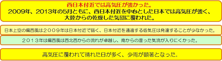 2009年と2013年5月の降水量(ミリ)と平年比(%) 平年比の小さい方から5位まで。 |
