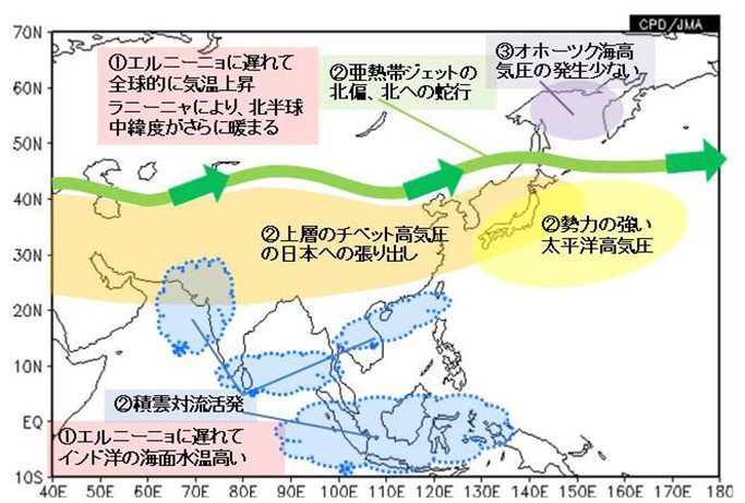 大気の流れの特徴と要因 ① 北半球中緯度の対流圏の気温は、1979 年以降の夏(6~8月)で最も高くなりました。 対流圏の気温は、エルニーニョ現象終了後に全球的に上昇し、高い状態が数カ月続くことがわかっています。また、ラニーニャ現象が発生している夏は、北半球中緯度の気温が高くなる傾向があります。2010 年は、春にエルニーニョ現象が終息し、夏にラニーニャ現象が発生しました。このため、エルニーニョ現象終了後の昇温効果とラニーニャ現象が発生したことによる影響で、北半球中緯度の気温が非常に高くなった可能性があります。 ② 日本付近は、勢力の強い太平洋高気圧の影響を受けやすくなりました。 7月中頃の梅雨明け以降、日本付近の亜熱帯ジェット気流は、平年と比べて北寄りに位置し、太平洋高気圧が日本付近に張り出しました。また、亜熱帯ジェット気流が日本付近でしばしば北側に蛇行し、上層のチベット高気圧が日本付近に張り出したことに伴い、本州付近で背の高い暖かい高気圧が形成されました。夏の後半(7月後半~8月)の日本付近での亜熱帯ジェット気流の北偏は、インド洋の対流活動が平年より活発になったことが一因とみられます。また、特に8月後半から9月初めにかけての日本付近の太平洋高気圧の強まりは、南シナ海北部からフィリピンの北東海上の対流活動が活発になったことが一因と考えられます。 ③ 冷涼なオホーツク海高気圧の影響をほとんど受けませんでした。 6月は北日本を中心に暖かい帯状の高気圧に覆われたため、かなり高温となりました。例年、北・東日本がオホーツク海高気圧の影響を受けやすい夏の前半(6月~7月前半)に、オホーツク海高気圧はほとんど形成されませんでした。7月後半は、日本付近の亜熱帯ジェット気流が平年に比べて北寄りに位置し、また、日本の東海上の太平洋高気圧が強かったため、北・東日本はオホーツク海高気圧による影響をほとんど受けませんでした。 |
