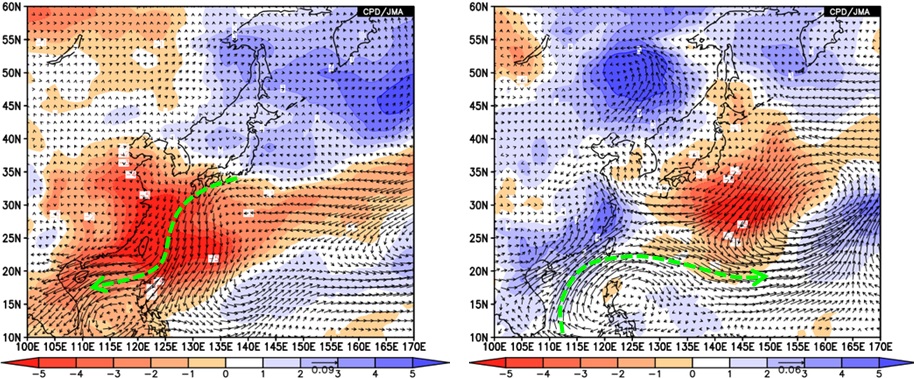 200hPaでは降水量がかなり多い年には、中東から日本付近にかけて高気圧性循環偏差と低気圧性循環偏差が交互に並び、大陸東岸付近に低気圧性循環偏差が位置して気圧の谷場となっています。一方、降水量がかなり少ない年にはインド洋北部からユーラシア大陸南部は広い範囲で高気圧性循環偏差が広がり、大陸東岸付近の高気圧性循環偏差が顕著となっています。日本の南東側には低気圧性循環偏差が位置しています。 下層(850hPa)では、かなり多い年には日本の南から東海上にかけて高気圧性循環偏差が位置し、湿った気流が入ります。かなり少ない年にはその逆の分布が見られ、日本を挟んで北西側に高気圧性循環、南東側に低気圧性循環が見られます。 |