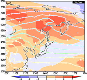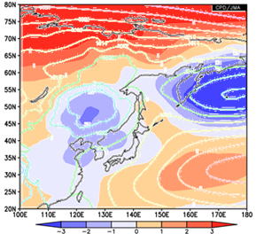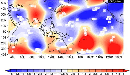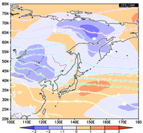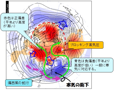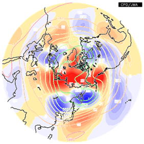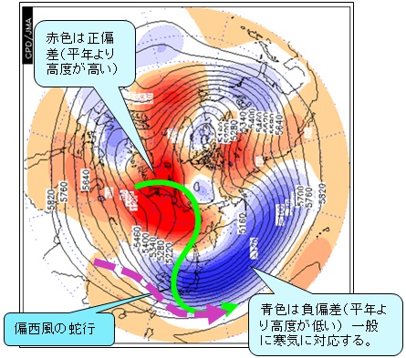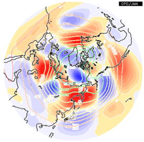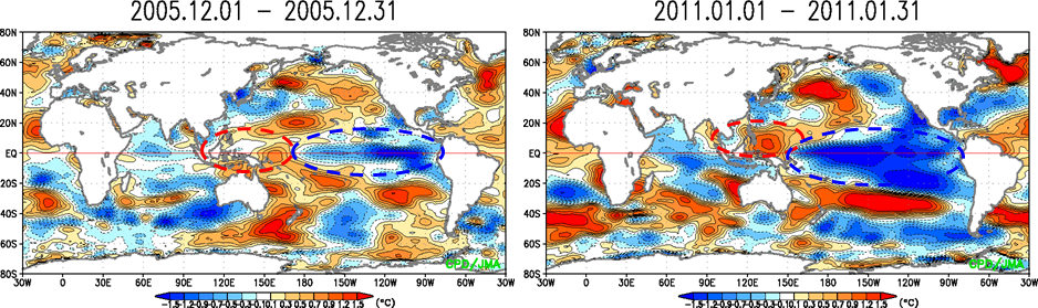 2011年1月平均の500hPa高度を見ると、極付近(赤点線内)から中緯度帯に寒気が南下しやすかった(青矢印)こと、中央シベリア~日本付近で偏西風が蛇行したことから、日本へ寒気が一層流入しやすくなりました。 太平洋西部熱帯域では海面水温が高く、インド洋東部からフィリピン付近の対流活動が活発となりました。このため、ユーラシア大陸南東岸で偏西風は北へ蛇行、日本の東海上では逆に南に蛇行し、日本に寒気を引き込みました。熱帯からの影響では、2005年12月と似た大気の流れが見られました。 |