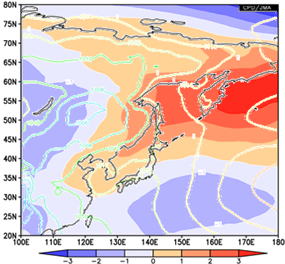 5月に降水量がかなり少ない年の合成図 左は250hPaの東西風、右は外向きの長波放射(対流活動に対応し、寒色は対流活動が活発(降水量が多い)をあらわします) |