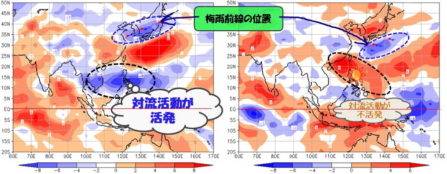 熱帯(フィリピン付近)の対流活動と日本付近の梅雨前線の位置 | ||