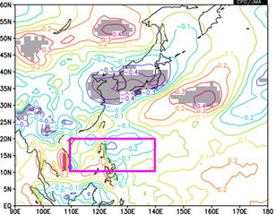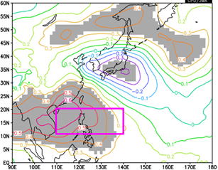 8月のフィリピン付近の対流活動と850hPa高度との回帰係数(1979~2013) |
