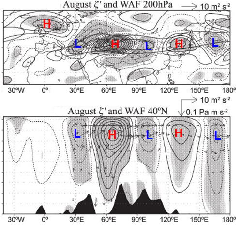 日本付近でのチベット高気圧の強まりは、偏西風(亜熱帯ジェット気流)の蛇行によってもたらされることが多くなります。 偏西風の蛇行はアジア西部から波のエネルギーの伝播(準定常ロスビー波束伝播)によって伝わります。偏西風が8月の気候的状態であれば、日本付近が気圧の尾根になりやすくなります。 左上図では、ヨーロッパから日本付近にかけてHとLが交互に連なり、これらを流す偏西風が蛇行します。下図(断面図)においても、H とLが東西に交互に連なって東進していることが分かります。 |