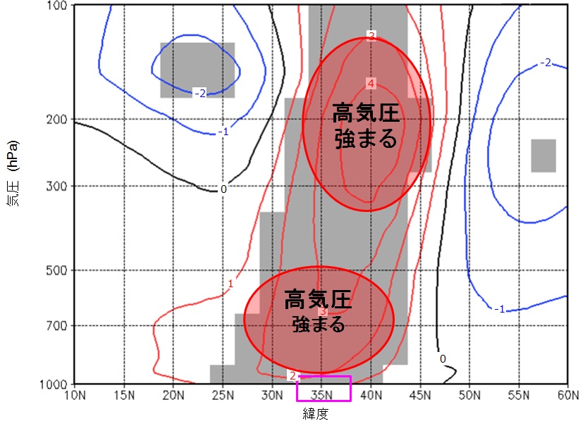 地上気温(32.5~37.5N、130~140E)と流線関数(130~140E)の回帰係数分布(8月前半)(95%有意な領域に陰影を付加) |