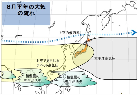 平年の8月は、上層のチベット高気圧と下層の太平洋高気圧が重なって背の高い高気圧となって日本を覆います(左図)。 チベット高気圧が強まると、偏西風が蛇行し、日本付近が気圧の尾根となって強固となり、晴れの日が続き、気温の高い日が続きます(右図) 。 盛夏期に、背の高い高気圧に覆われると、晴れて気温の高い日が続き、猛暑となります。上層のチベット高気圧と下層の太平洋高気圧が日本付近で共に強くなると、連日の猛暑日となることがあります。 |