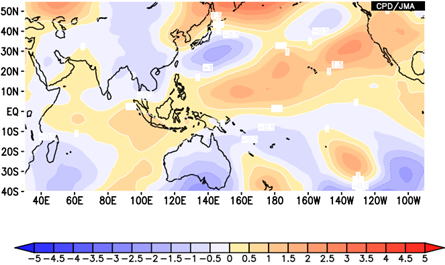 フィリピン付近の対流活動とテレコネクション(PJパターン) 夏にフィリピン付近で対流活動(積乱雲の活動)が活発になると、本州付近の高気圧が強まり、気温が高くなるという相関関係があります。このような相関関係はテレコネクションと呼ばれ、そのうちでこのパターンをPJ(Pacific-Japan)パターンと呼んでいます(Nitta, 1984)。 波のエネルギーの伝播によるほか、東アジアでは、このパターンを増幅させやすい大気の流れになっていることが、頻繁にPJパターンが見られる背景にあると考えられます。 |