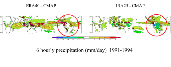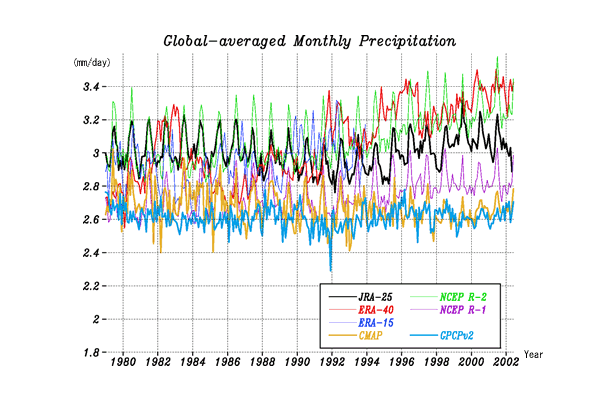 | JRA-25は、降水量をよく表現している。全球平均降水量は、明らかな上昇や火山噴火による低下は見られず 期間を通して3mm/day前後で、他の再解析データと比べてもっとも安定している。 また降水量の大きさは、他の多くの再解析データと同様にGPCPやCMAPなどの”観測された”降水量に比べて大きい。 | ||||