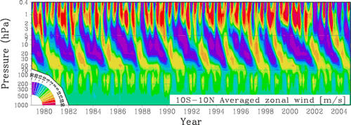 10-50hPaを中心とした下部成層圏に準二年周期振動(QBO)、10hPaより上の上部成層圏に半年周期振動(SAO)が見られる。