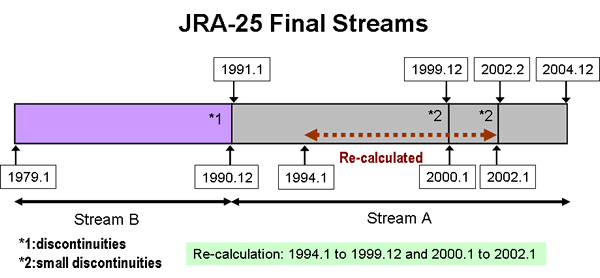 | また、観測データの問題により2つの再計算を実施した。1994年1月から1999年12月まではGMS-AMVが低品質であったためであり、2000年1月から2002年1月までは熱低周辺風データのY2K問題による。 このため、2000年1月と2002年2月初めにも小さな不連続がある。 | ||