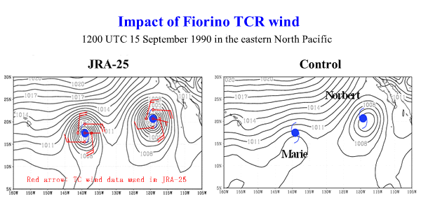 | 熱低低気圧周辺風の利用により、JRA-25は、他の再解析データと比べて、熱帯低気圧が現実的に表現される。典型的な解析事例として、1990年9月における、東部北太平洋の海面気圧分布を、観測された熱帯低気圧の位置とともに示す。図では、比較のため、熱低周辺風を利用しないコントロール実験の結果も示している。東部北太平洋では、熱低周辺風による解析品質の向上が著しい。 | ||