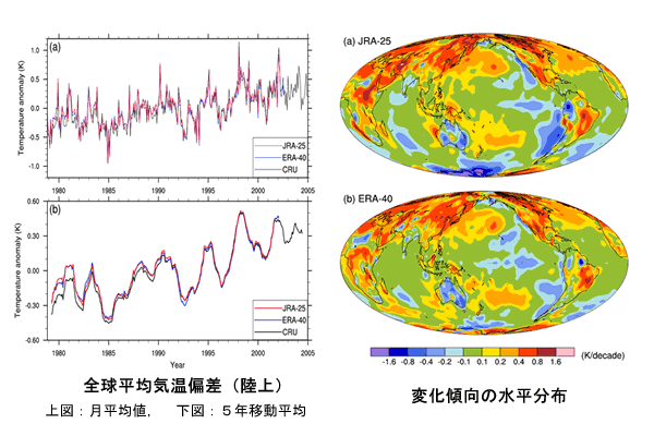 | JRA-25のデータには、地表解析から出力される解析値も含まれる。 この地表解析は、大気の3次元変分法とは切り離されており、大気の第一推定値から診断的に求められた地表の第一推定値と種々の地上観測データから、 2次元最適内挿法で解析される。このような扱いは、ERA-40などの他の再解析でも同様である。 ここでは、地表解析からの出力要素である地上2m高度の気温について、JRA-25、ERA-40、およびCRUTEM2vデータ(以下、CRUデータ)を 比較する。CRUデータは、世界中の約3000地点の陸上観測に基づく5度毎の緯度・経度データであり、気候変動研究等において標準的に使われる観測データである。 月々の変動、長期的な変化傾向とも3データ間で良く対応している。 | ||||