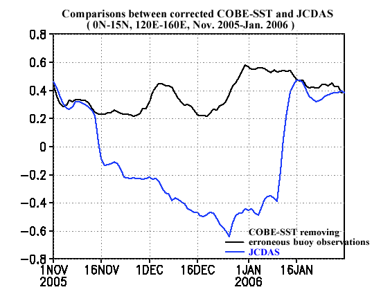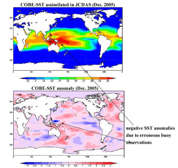 | Erroneous buoy observations were assimilated in JCDAS. They produced negative biases in SST analysis as noted below. Please note this point when you use our data. | |||||