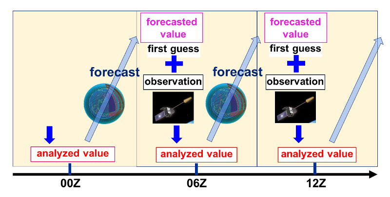 The JRA-55 system produces continuous long-term data by performing data assimilation cycles every six hours.