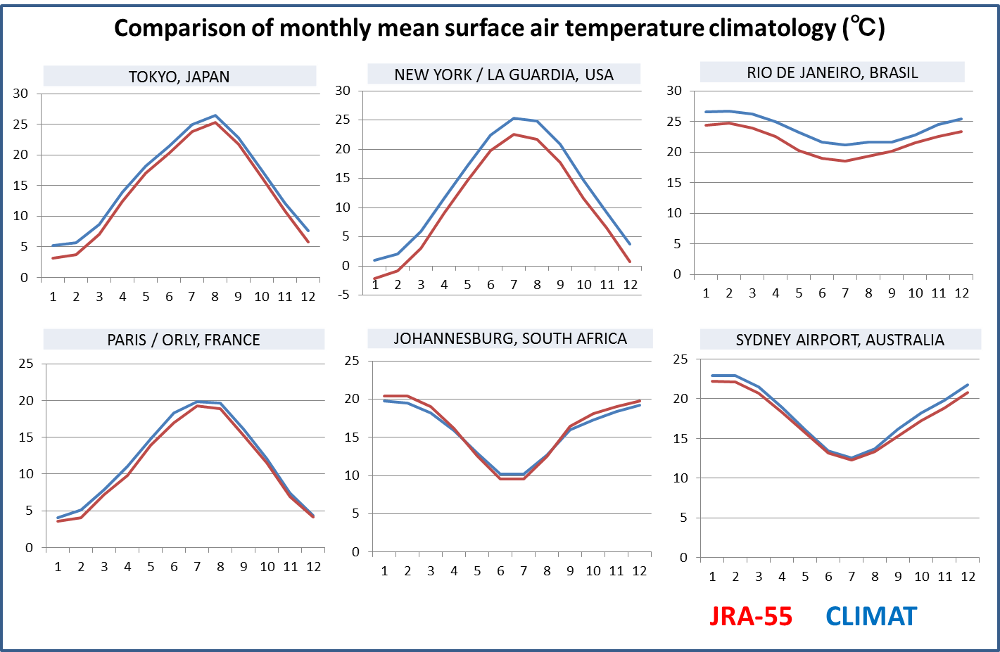 It should be noted that JRA-55 presents mean values based on a model grid, while CLIMAT contains point data.