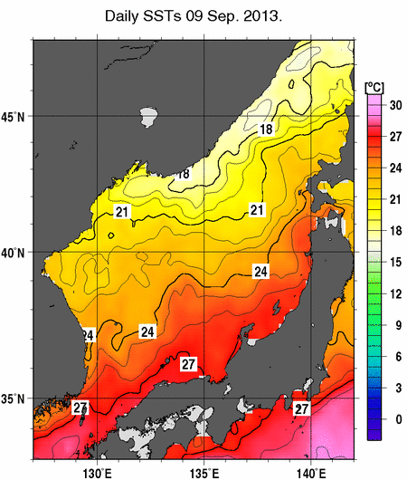 「解説」に戻る日本海の深さ200mの水温分布図(9月9日)
