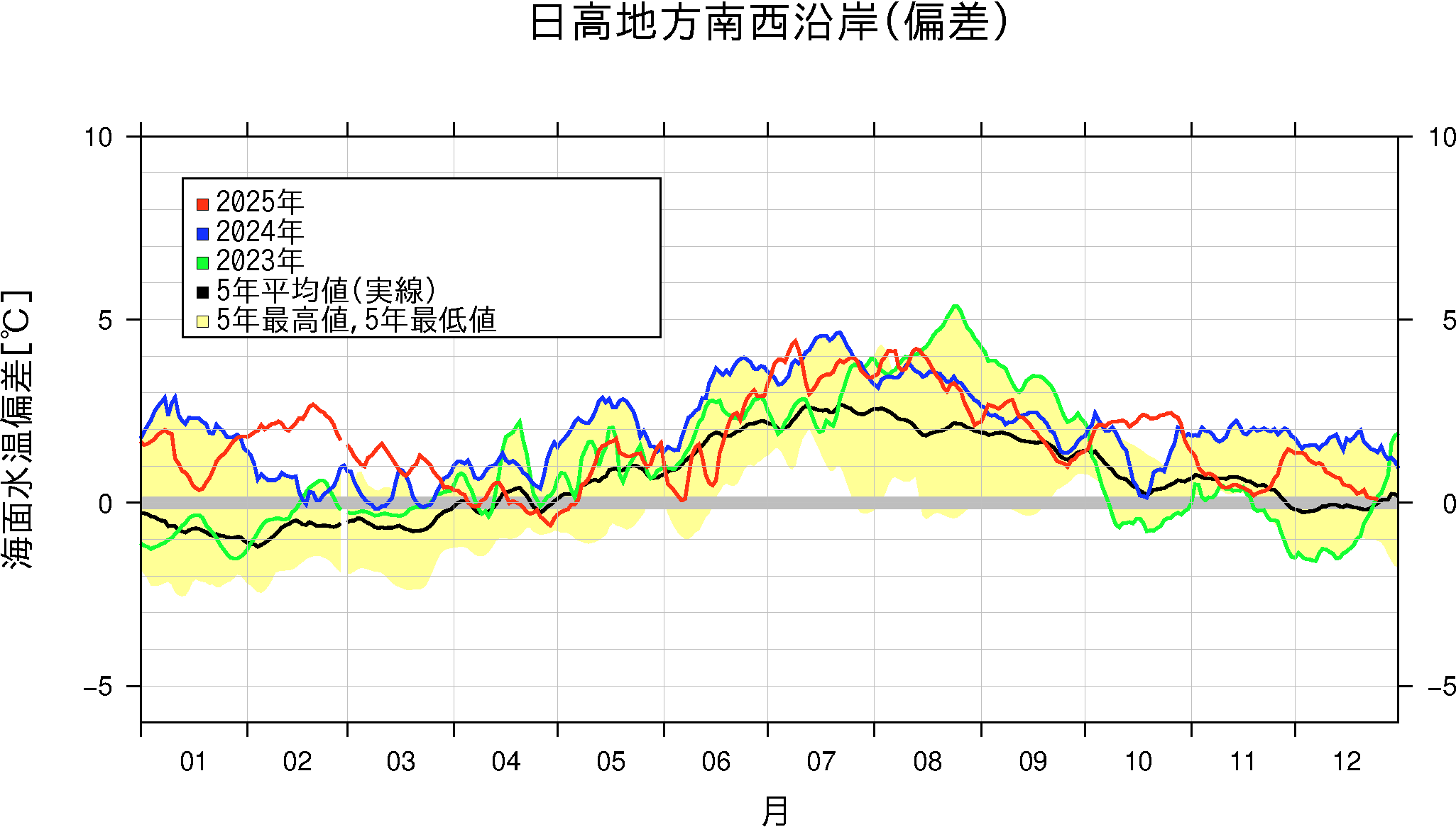 このグラフは、右上地図に赤色で示した海域の日別海域平均海面水温の過去3年分の推移を示しています。海面水温偏差は、平年値(1991〜2020年の30年間の平均値)からの差です。直近の値は速報値です。後日、後から入手した観測データを用いて解析をやり直した再解析値に更新されます。5年統計値(平均値・最高値・最低値)の期間は2020~2024年です。詳細は、解説と変更履歴をご覧ください。