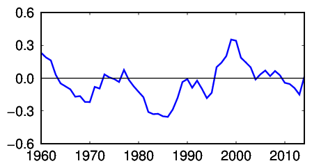 日本近海の海面水温には、長期的な昇温傾向とともに十年〜数十年の時間規模の周期変動が見られます。太平洋の海面水温に見られる十年〜数十年規模の変動や大西洋の海面水温に見られる十年〜数十年規模の変動については様々な研究結果から全球規模の気候変動と関連していると考えられています。日本近海の海面水温の十年規模変動については、特に1950年代以前は観測データが少ないため十分に調べられていませんが、最近数十年の十年規模変動についての研究が行われています。このページでは、1950年代末以降の日本近海の海面水温の十年規模変動の要因について分かってきたことを示します。