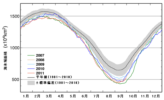 2007年~2011年(2011年は9月30日まで)の北極域の各日の海氷域面積と平年値・標準偏差(1981年~2010年)。