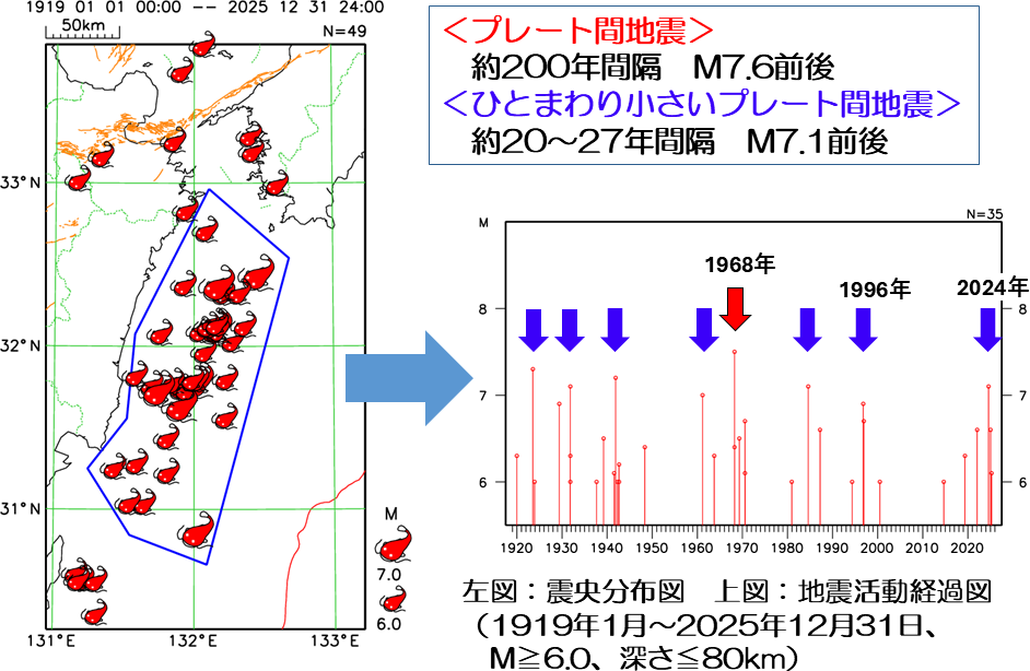 日向灘ではM7.6前後の規模の地震のほか、それよりひとまわり小さいM7.0~7.2程度の規模の地震が