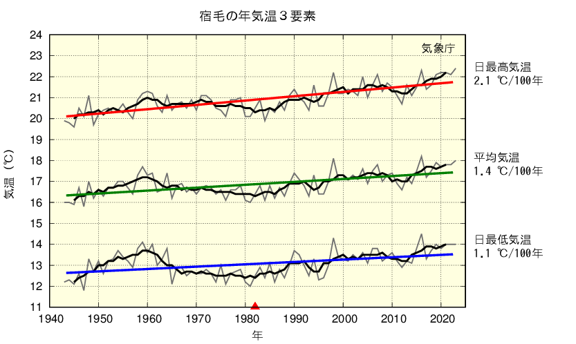 図中の細い折れ線グラフは毎年の値、太い黒線の折れ線グラフは5年移動平均値、赤・緑・青の直線は長期変化傾向、▲は観測所の移転を示しています。移転の前後で観測環境が異なるため、移転以前の平均気温は移転後と均質になるように補正しています。