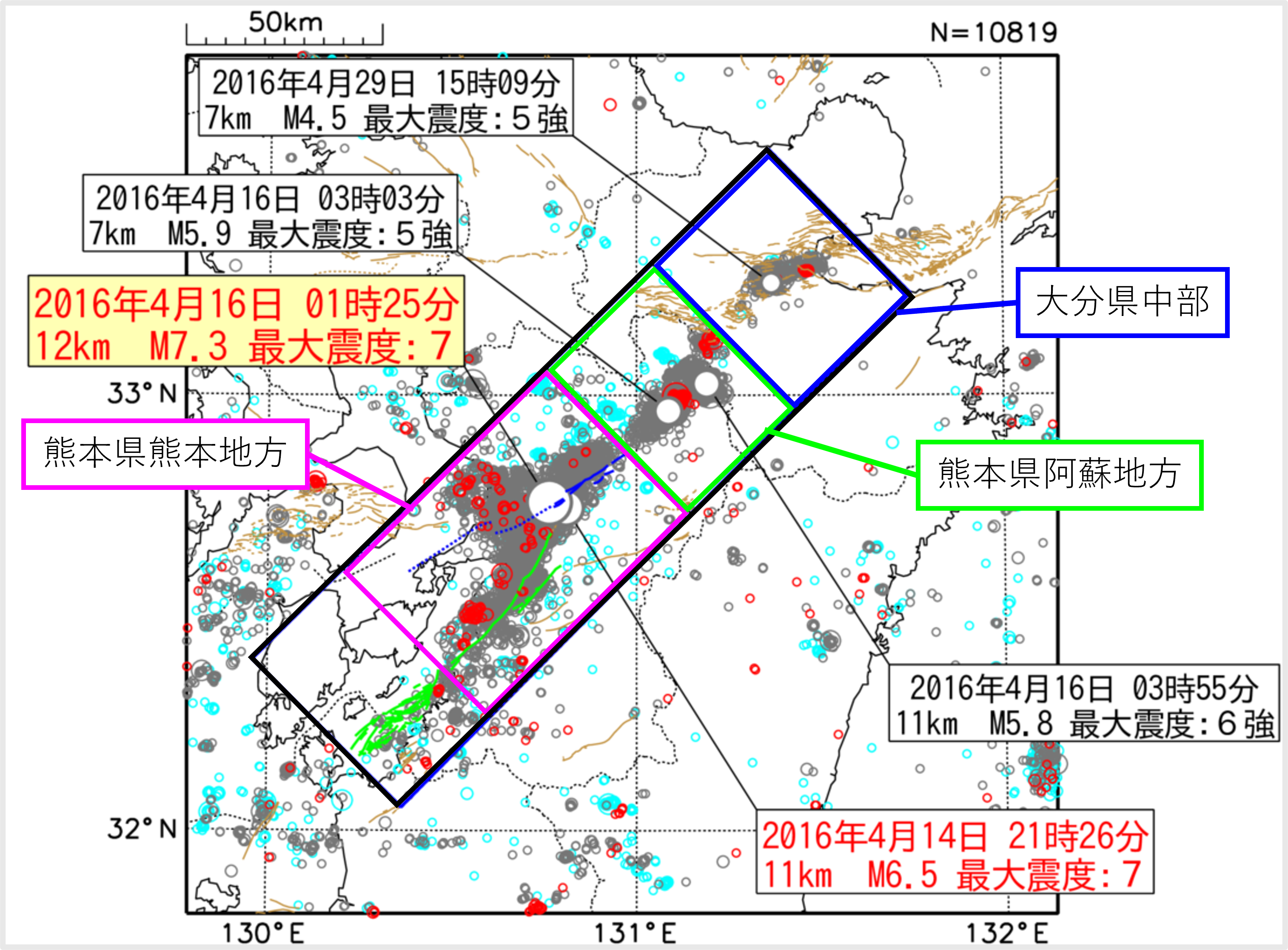 熊本県から大分県にかけての広い範囲で、強い揺れを伴う地震が多く発生したんだ。