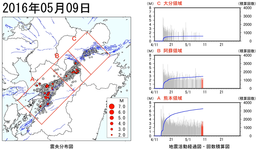 まず、2016年4月14日から5月31日までの熊本地震の各エリア別の地震活動を見てみよう。