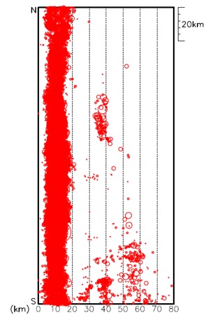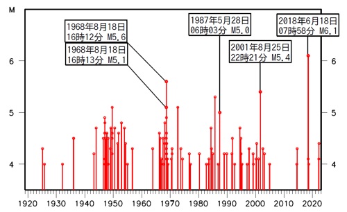 地震に吹き出しを付加。橙色の線は地震調査研究推