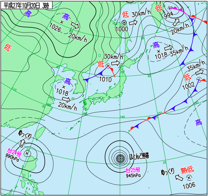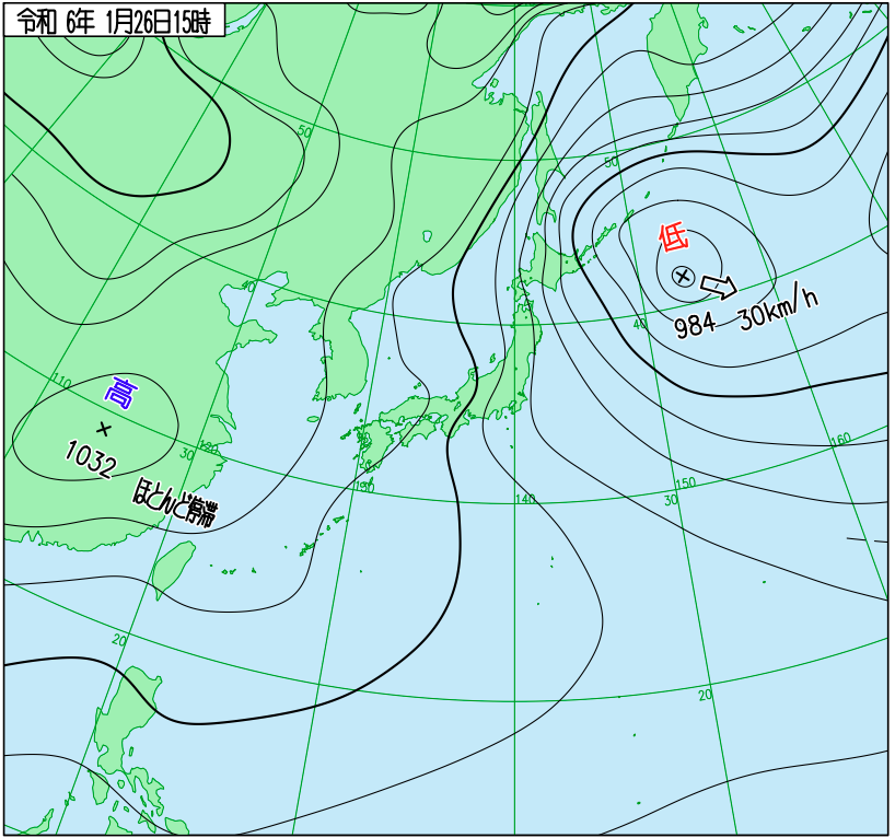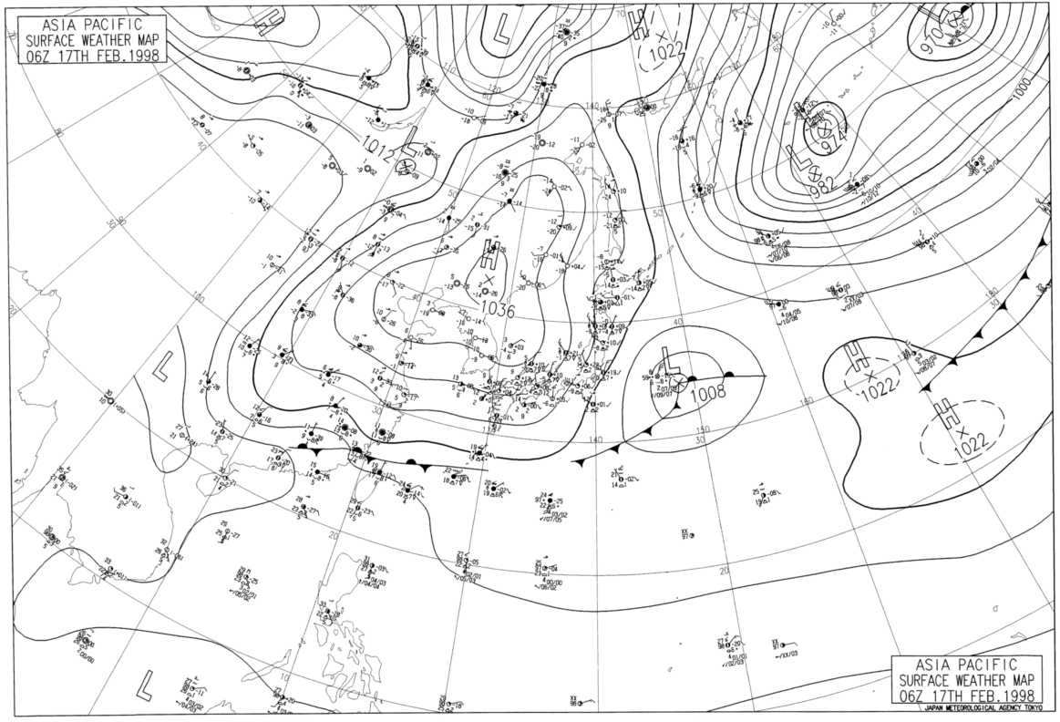 当時の天気図を確認すると、中国東北区に中心を持つ高気圧があり、日本の東には低気圧があって、日本付近は等圧線が縦に並んだ西高東低の気圧配置になっていることが分かります。