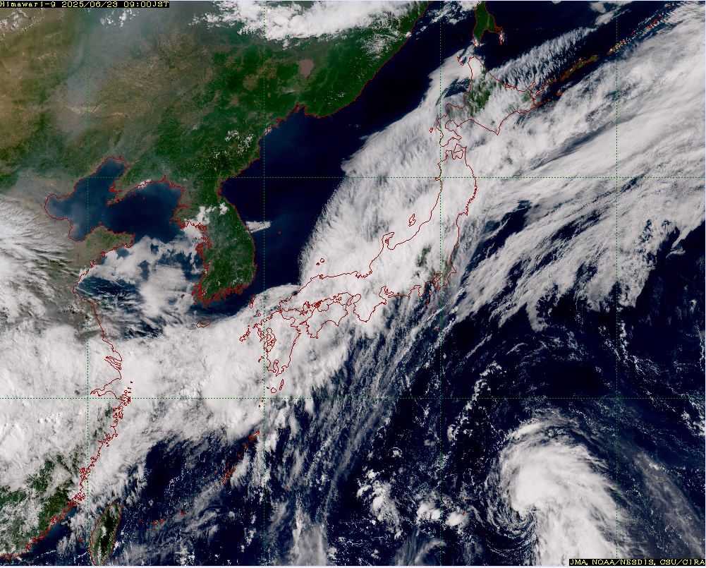 令和7年6月23日9時の天気図を見ると、北日本から華中にかけて梅雨前線が停滞していることがわかり、衛星画像で前線に対応した雲が広がっていることが確認できます。