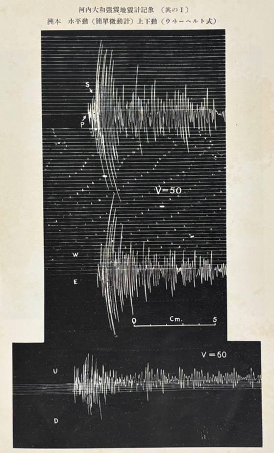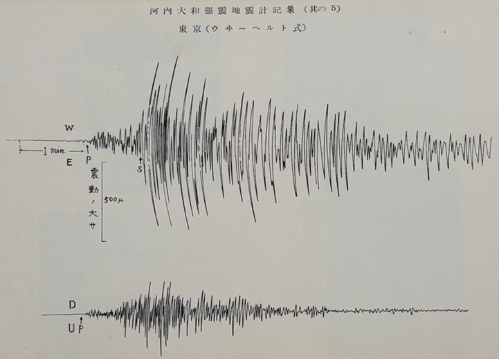 【河内大和強震調査報告の原文】本所内に於ては南面の硝子窓一枚破壊し所々に壁の亀裂を生じ応接室のドアーの板が一枚剥され振子時計は全部停止した、地震計は倍率卅倍の大森式簡単微動計であるが本地震の如く震源が近い上に強震のため東西動の描針は一たまりもなく記録紙外に飛び出し其の上地震計が台石に固定してないので移動するなど是等を手早く直すのに苦労した、斯様の状態であるから遂に最大振幅を測ることができなかったのは遺憾千万である、若し強震計が有ったら充分の観測が出来たものをと思い今更ながら強震計の必要を痛切に感じた。【ここまで】