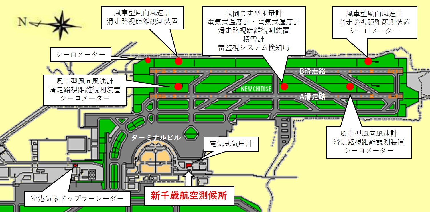 新千歳空港はおよそ南北方向に平行に滑走路が2本(A滑走路、B滑走路)あり、A・B滑走路のそれぞれ両端と2本の滑走路間の中央に、観測測器が設置されている場所(露場と言います)があります。