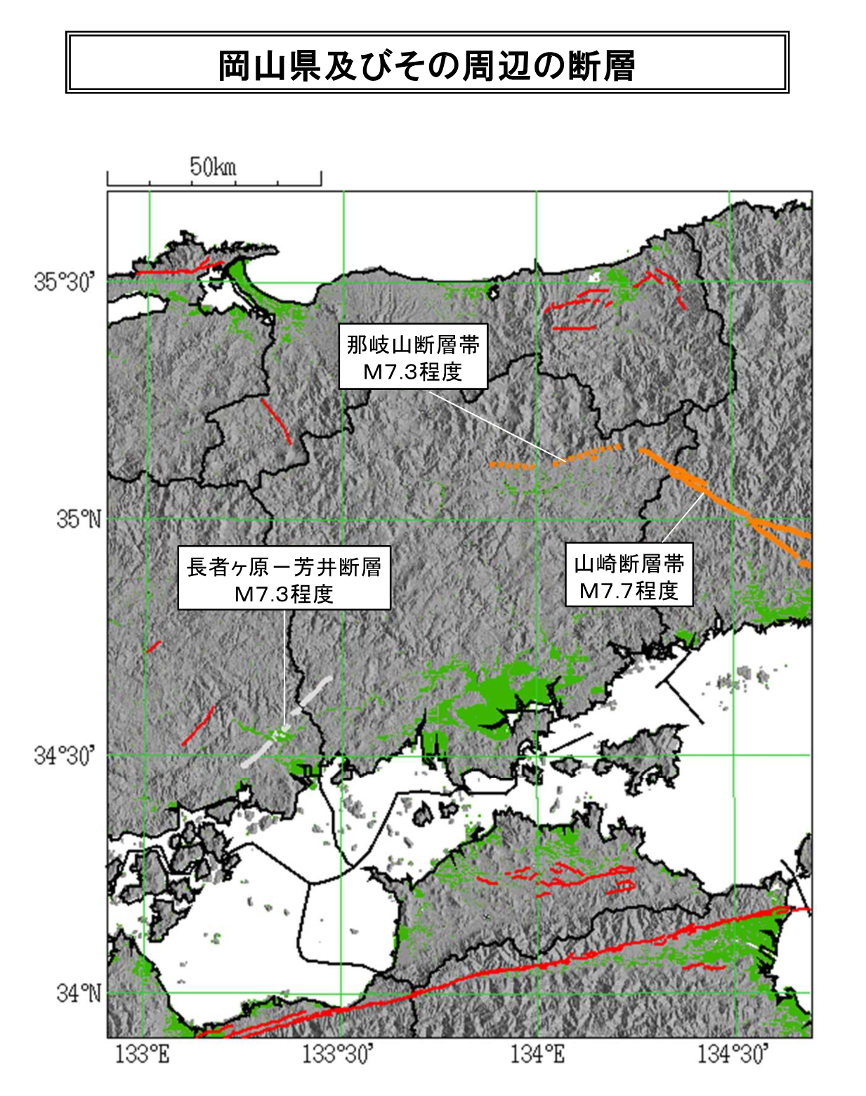 岡山県とその周辺には、左図に示したように主に3つの活断層があります。 他県に比べると、県内にある活断層が少ないため、地震の被害が少ないと 言われることがあります。 しかし、実際には、周辺にある活断層などの地震により、県内でも強い揺れを観測する例が度々起こっています。 地震の強い揺れにより直接的な被害を生じるだけでなく、地盤が緩んで土砂災害が起こりやすくなったり、地盤沈下が起これば高潮の被害に遭う危険性が高まったりします。 また、発生の切迫性が高まってきている「南海トラフ地震」の発生によっても、強い揺れや津波による被害、干拓・埋め立て地を中心とした「液状化現象」などによる大きな被害も予測されています。 大きな被害をもたらすような地震が突然発生してもできるだけ被害を軽減できるよう、日頃から災害に対する備えをしっかり整えておくことが大切です。