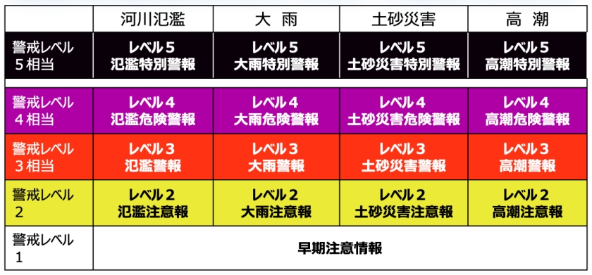 新たな防災気象情報は、情報名称に警戒レベルの数字を付記するなど、市町村が発令する避難指示等の避難情報や住民がとるべき避難行動との関係が分かりやすくなります。詳細は特設サイトをご覧ください。