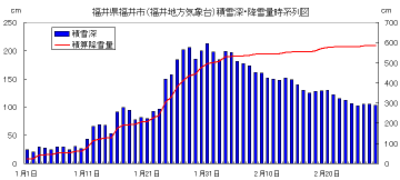 冬型の気圧配置が続く中、前線や小低気圧が日本海で発生して通過したため、平野部での降雪が多くなった。最深積雪は福井で213cm、富山186cm、金沢181cm、伏木(富山県高岡市)225cm、長岡(新潟県長岡市)318cmを観測した。