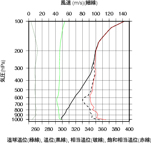 表中のMUCAPE850hPaは、最不安定CAPE(地上~850hPa高度間で)を示す。 気温、露点の鉛直分布(エマグラム)館野 1965年08月21日09時(高層気象観測データを使用)![]() 赤線は、地表付近の空気塊を仮想的に上昇させたときの空気塊の温度の変化を示す。 湿球温位、温位、相当温位、飽和相当温位の鉛直分布館野 1965年08月21日09時(高層気象観測データを使用)![]() 風のホドグラフ(広域)館野 1965年08月21日09時(高層気象観測データを使用)![]() 風のホドグラフ(拡大)館野 1965年08月21日09時(高層気象観測データを使用)![]() |