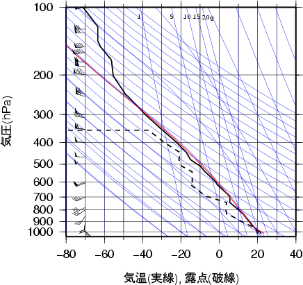 表中のMUCAPE850hPaは、最不安定CAPE(地上~850hPa高度間で)を示す。 気温、露点の鉛直分布(エマグラム)南大東島 1975年02月06日09時(高層気象観測データを使用)![]() 赤線は、地表付近の空気塊を仮想的に上昇させたときの空気塊の温度の変化を示す。 湿球温位、温位、相当温位、飽和相当温位の鉛直分布南大東島 1975年02月06日09時(高層気象観測データを使用)![]() 風のホドグラフ(広域)南大東島 1975年02月06日09時(高層気象観測データを使用)![]() 風のホドグラフ(拡大)南大東島 1975年02月06日09時(高層気象観測データを使用)![]() |
