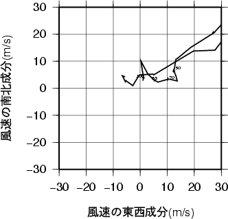 表中のMUCAPE850hPaは、最不安定CAPE(地上~850hPa高度間で)を示す。 気温、露点の鉛直分布(エマグラム)米子 1975年05月31日09時(高層気象観測データを使用)![]() 赤線は、地表付近の空気塊を仮想的に上昇させたときの空気塊の温度の変化を示す。 湿球温位、温位、相当温位、飽和相当温位の鉛直分布米子 1975年05月31日09時(高層気象観測データを使用)![]() 風のホドグラフ(広域)米子 1975年05月31日09時(高層気象観測データを使用)![]() 風のホドグラフ(拡大)米子 1975年05月31日09時(高層気象観測データを使用)![]() |