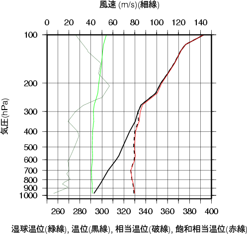 表中のMUCAPE850hPaは、最不安定CAPE(地上~850hPa高度間で)を示す。 気温、露点の鉛直分布(エマグラム)鹿児島 1976年02月28日21時(高層気象観測データを使用)![]() 赤線は、地表付近の空気塊を仮想的に上昇させたときの空気塊の温度の変化を示す。 湿球温位、温位、相当温位、飽和相当温位の鉛直分布鹿児島 1976年02月28日21時(高層気象観測データを使用)![]() 風のホドグラフ(広域)鹿児島 1976年02月28日21時(高層気象観測データを使用)![]() 風のホドグラフ(拡大)鹿児島 1976年02月28日21時(高層気象観測データを使用)![]() |