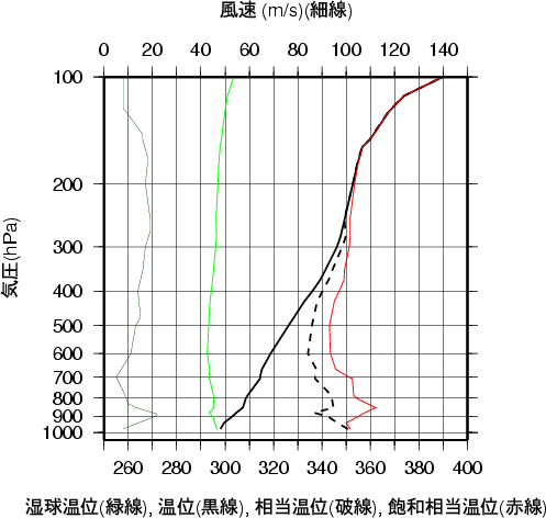 表中のMUCAPE850hPaは、最不安定CAPE(地上~850hPa高度間で)を示す。 気温、露点の鉛直分布(エマグラム)鹿児島 1979年09月03日09時(高層気象観測データを使用)![]() 赤線は、地表付近の空気塊を仮想的に上昇させたときの空気塊の温度の変化を示す。 湿球温位、温位、相当温位、飽和相当温位の鉛直分布鹿児島 1979年09月03日09時(高層気象観測データを使用)![]() 風のホドグラフ(広域)鹿児島 1979年09月03日09時(高層気象観測データを使用)![]() 風のホドグラフ(拡大)鹿児島 1979年09月03日09時(高層気象観測データを使用)![]() |
