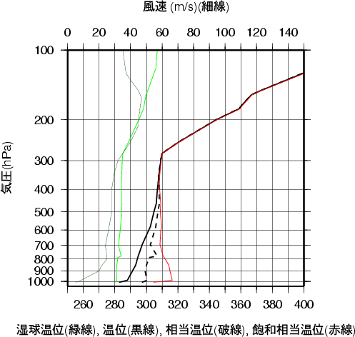 表中のMUCAPE850hPaは、最不安定CAPE(地上~850hPa高度間で)を示す。 気温、露点の鉛直分布(エマグラム)米子 1983年04月03日21時(高層気象観測データを使用)![]() 赤線は、地表付近の空気塊を仮想的に上昇させたときの空気塊の温度の変化を示す。 湿球温位、温位、相当温位、飽和相当温位の鉛直分布米子 1983年04月03日21時(高層気象観測データを使用)![]() 風のホドグラフ(広域)米子 1983年04月03日21時(高層気象観測データを使用)![]() 風のホドグラフ(拡大)米子 1983年04月03日21時(高層気象観測データを使用)![]() |