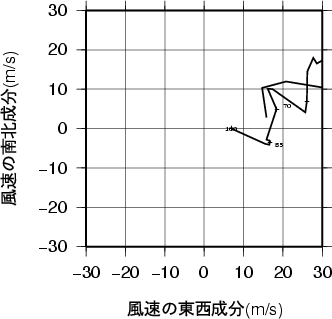 表中のMUCAPE850hPaは、最不安定CAPE(地上~850hPa高度間で)を示す。 気温、露点の鉛直分布(エマグラム)浜松 1986年12月19日21時(高層気象観測データを使用)![]() 赤線は、地表付近の空気塊を仮想的に上昇させたときの空気塊の温度の変化を示す。 湿球温位、温位、相当温位、飽和相当温位の鉛直分布浜松 1986年12月19日21時(高層気象観測データを使用)![]() 風のホドグラフ(広域)浜松 1986年12月19日21時(高層気象観測データを使用)![]() 風のホドグラフ(拡大)浜松 1986年12月19日21時(高層気象観測データを使用)![]() |