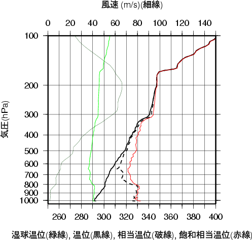 表中のMUCAPE850hPaは、最不安定CAPE(地上~850hPa高度間で)を示す。 気温、露点の鉛直分布(エマグラム)館野 1988年06月18日09時(高層気象観測データを使用)![]() 赤線は、地表付近の空気塊を仮想的に上昇させたときの空気塊の温度の変化を示す。 湿球温位、温位、相当温位、飽和相当温位の鉛直分布館野 1988年06月18日09時(高層気象観測データを使用)![]() 風のホドグラフ(広域)館野 1988年06月18日09時(高層気象観測データを使用)![]() 風のホドグラフ(拡大)館野 1988年06月18日09時(高層気象観測データを使用)![]() |