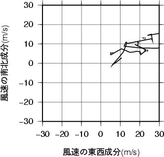 表中のMUCAPE850hPaは、最不安定CAPE(地上~850hPa高度間で)を示す。 気温、露点の鉛直分布(エマグラム)八丈島 1992年10月30日21時(高層気象観測データを使用)![]() 赤線は、地表付近の空気塊を仮想的に上昇させたときの空気塊の温度の変化を示す。 湿球温位、温位、相当温位、飽和相当温位の鉛直分布八丈島 1992年10月30日21時(高層気象観測データを使用)![]() 風のホドグラフ(広域)八丈島 1992年10月30日21時(高層気象観測データを使用)![]() 風のホドグラフ(拡大)八丈島 1992年10月30日21時(高層気象観測データを使用)![]() |