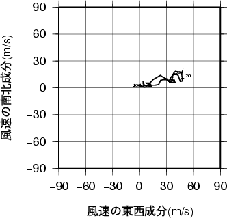 表中のMUCAPE850hPaは、最不安定CAPE(地上~850hPa高度間で)を示す。 気温、露点の鉛直分布(エマグラム)米子 1993年10月17日09時(高層気象観測データを使用)![]() 赤線は、地表付近の空気塊を仮想的に上昇させたときの空気塊の温度の変化を示す。 湿球温位、温位、相当温位、飽和相当温位の鉛直分布米子 1993年10月17日09時(高層気象観測データを使用)![]() 風のホドグラフ(広域)米子 1993年10月17日09時(高層気象観測データを使用)![]() 風のホドグラフ(拡大)米子 1993年10月17日09時(高層気象観測データを使用)![]() |