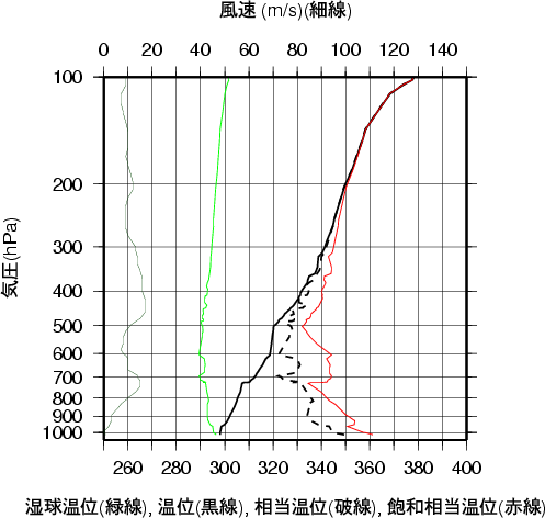 表中のMUCAPE850hPaは、最不安定CAPE(地上~850hPa高度間で)を示す。 気温、露点の鉛直分布(エマグラム)那覇 1998年10月30日09時(高層気象観測データを使用)![]() 赤線は、地表付近の空気塊を仮想的に上昇させたときの空気塊の温度の変化を示す。 湿球温位、温位、相当温位、飽和相当温位の鉛直分布那覇 1998年10月30日09時(高層気象観測データを使用)![]() 風のホドグラフ(広域)那覇 1998年10月30日09時(高層気象観測データを使用)![]() 風のホドグラフ(拡大)那覇 1998年10月30日09時(高層気象観測データを使用)![]() |