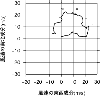 表中のMUCAPE850hPaは、最不安定CAPE(地上~850hPa高度間で)を示す。 気温、露点の鉛直分布(エマグラム)浜松 2000年09月11日21時(高層気象観測データを使用)![]() 赤線は、地表付近の空気塊を仮想的に上昇させたときの空気塊の温度の変化を示す。 湿球温位、温位、相当温位、飽和相当温位の鉛直分布浜松 2000年09月11日21時(高層気象観測データを使用)![]() 風のホドグラフ(広域)浜松 2000年09月11日21時(高層気象観測データを使用)![]() 風のホドグラフ(拡大)浜松 2000年09月11日21時(高層気象観測データを使用)![]() |